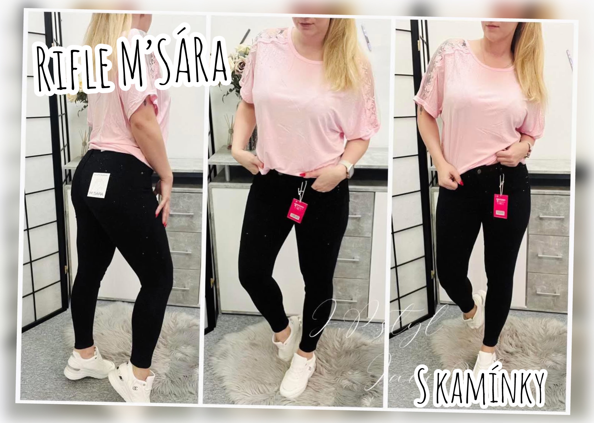 ČERNÉ RIFLE M'SÁRA  zdobené černými kamínky push/up efekt přední kapsy zadní kapsy slim fit ROZMĚR:XS - délka 96cm, pas 2* 30/38cmS - délka 97cm, pas 2* 32/40cm celý popis