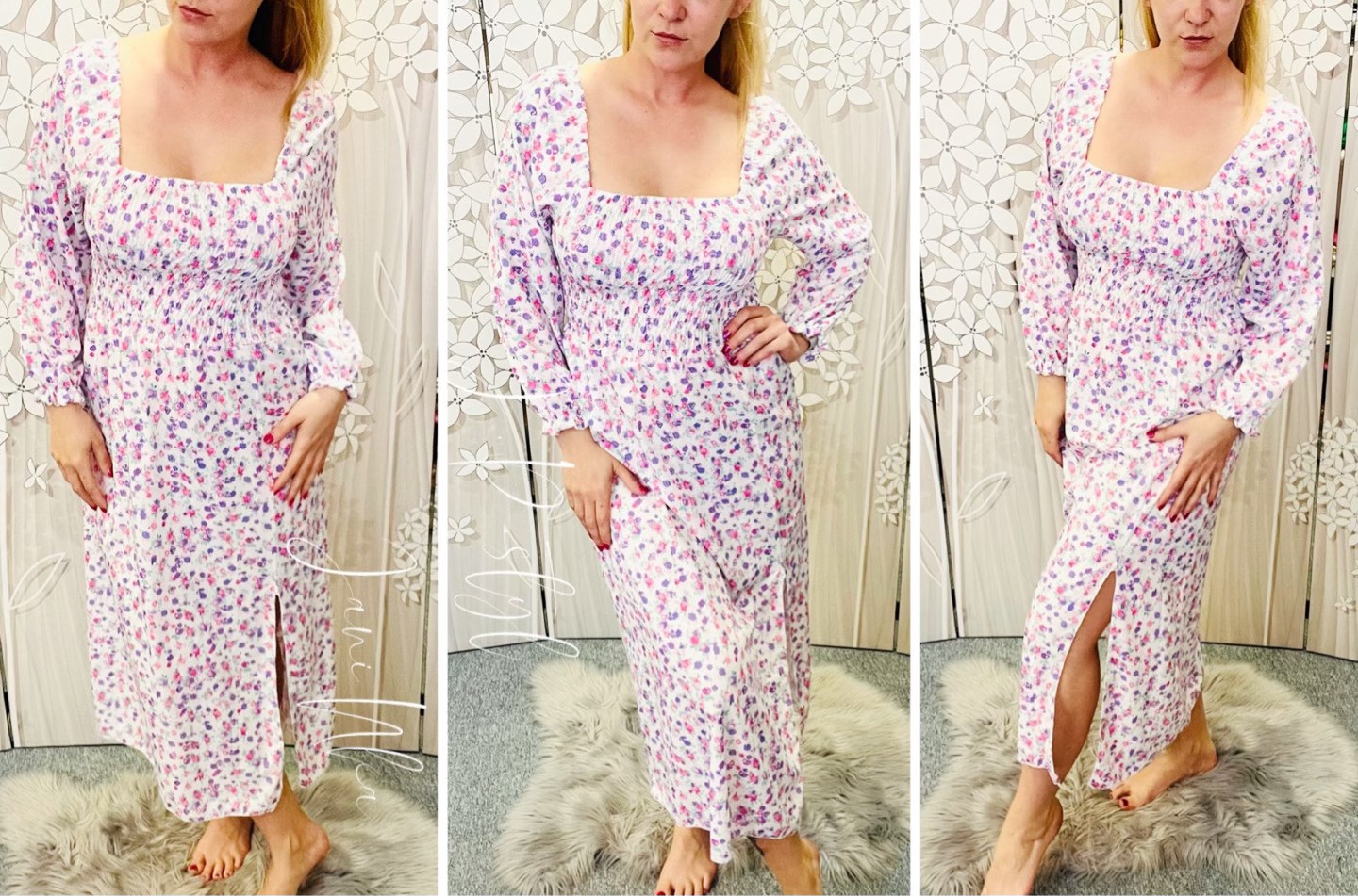 🌸Delší šaty s jemným květinovým motivem Alia 🌸, které mají přes hrudník široké žabičkování pro pohodlné a elegantní nošení. 🌸Dlouhý rukávek je zakončen pružnou gumou, která dodává šatům na praktičnosti a stylu.🌸