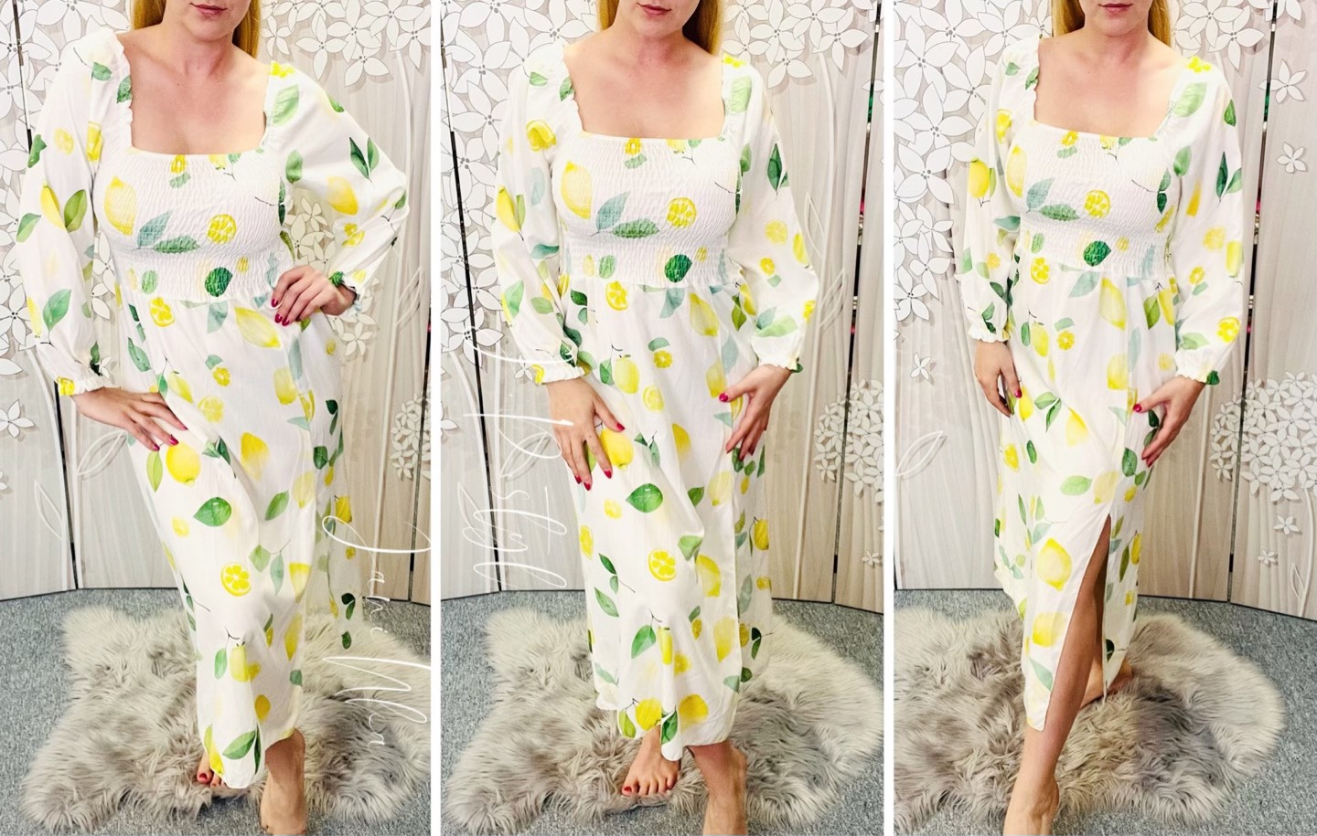 🍋Delší šaty s jemným citronovým motivem Alia 🍋, které mají přes hrudník široké žabičkování pro pohodlné a elegantní nošení. 🍋 Dlouhý rukávek je zakončen pružnou gumou, která dodává šatům na praktičnosti a stylu. 🍋