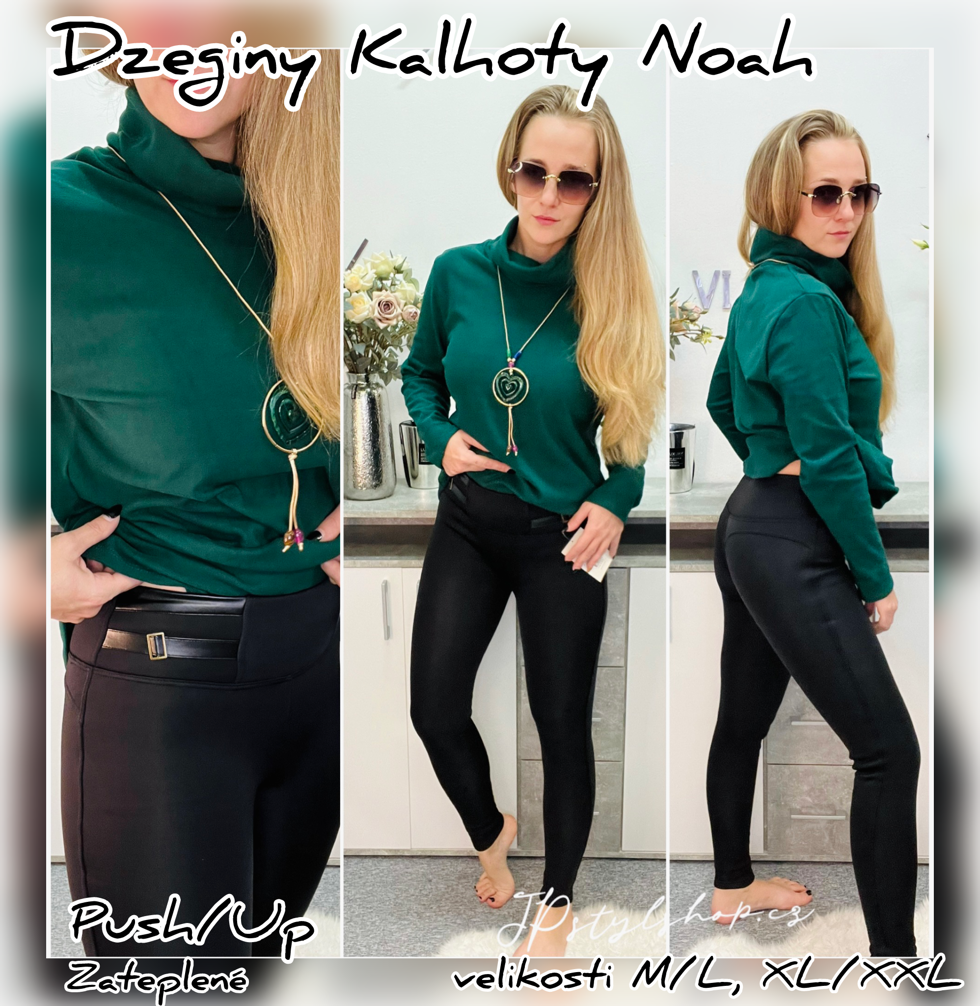 Džegínové kalhoty Noah Džegínové kalhoty Noah s vyšším pasem a širokou gumou pro pohodlné nošení. Přední část pasu zdobená koženkovými pásky. Hladký design bez kapes, zateplené pro chladnější dny, s Push/up efektem a srdíčkovým motivem na zadku pro krásný tvar.   Džegínové kalhoty Noah vyšší pas ... celý popis