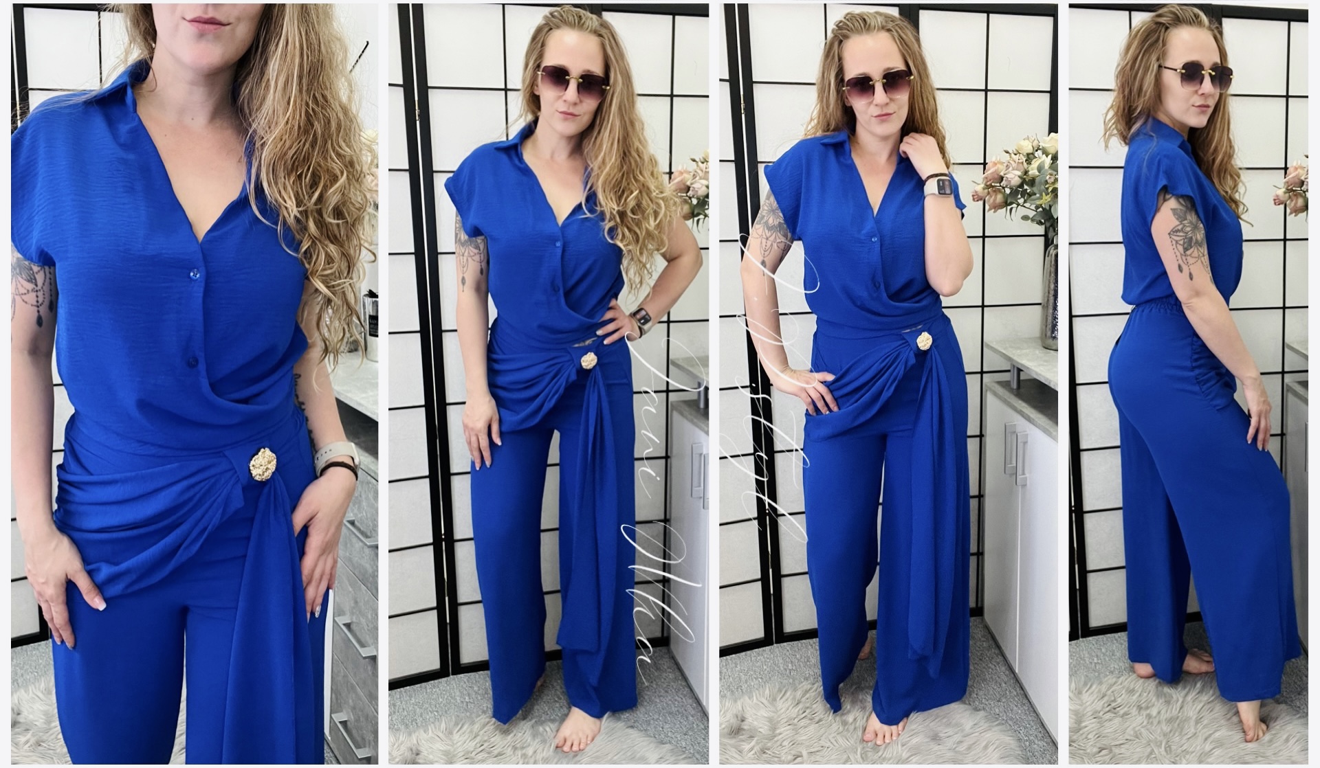 - volnočasové kalhoty celkově široké nohavice, v zadní části guma, z přední části elegantní nabíraný "šál" s broží