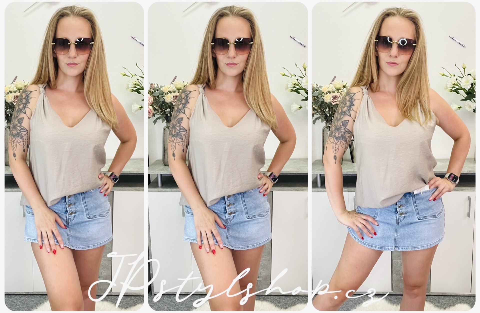 🌸Jednobarevné tílko, vyrobené z velmi příjemného a kvalitního materiálu obsahující 88% viskózy a 12% nylon. 🌸 Tílko je opatřeno šiřšími ramínky s elegantním zdobením, které dodává modelu zajímavý detail.🌸