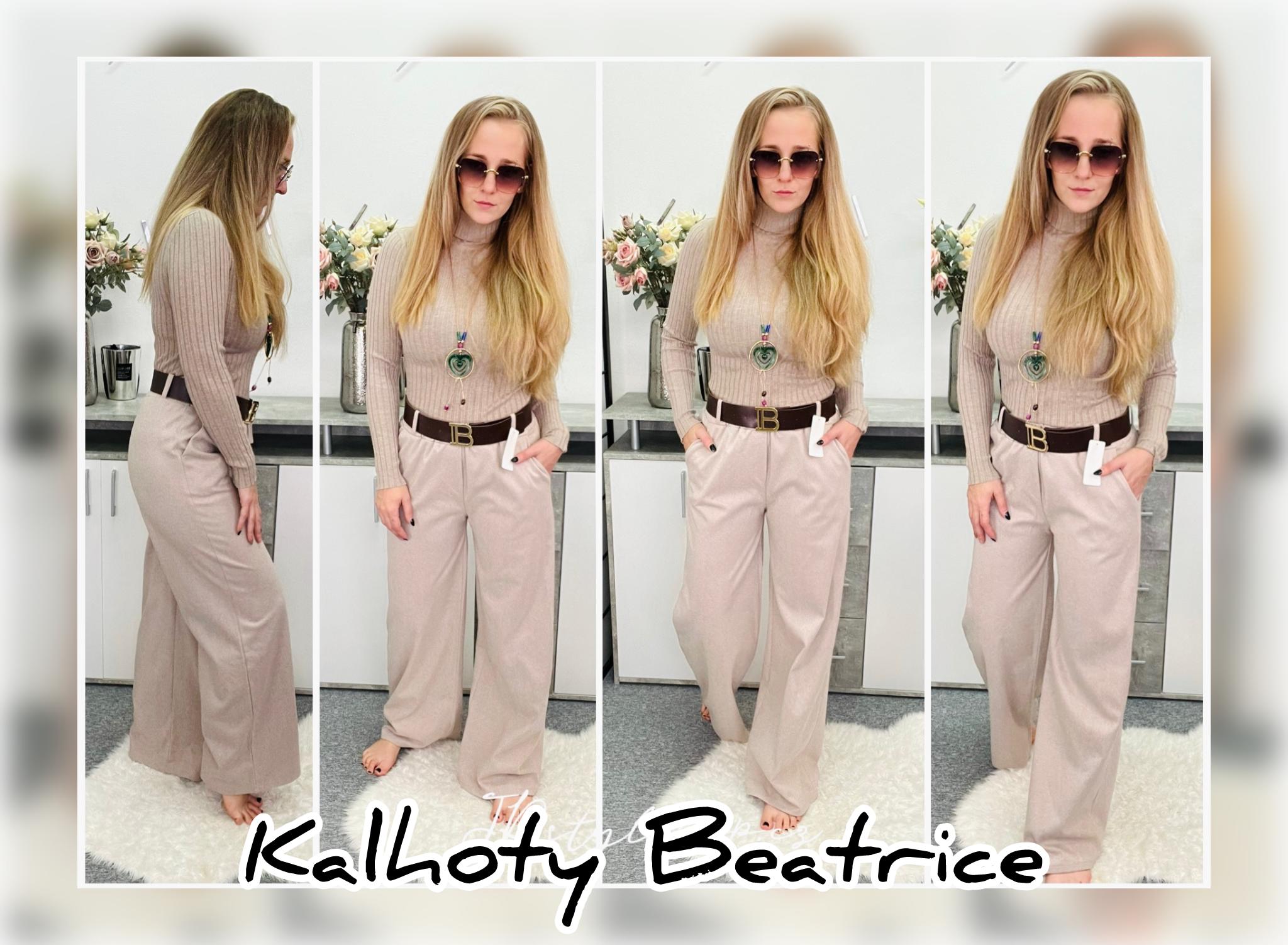 Elegantní kalhoty s výrazným širokým páskem ozdobeným písmenkem B jsou ideální volbou pro pohodlný, ale stylový vzhled. V pase je praktická guma, která zajišťuje perfektní přizpůsobení a vysokou pružnost.