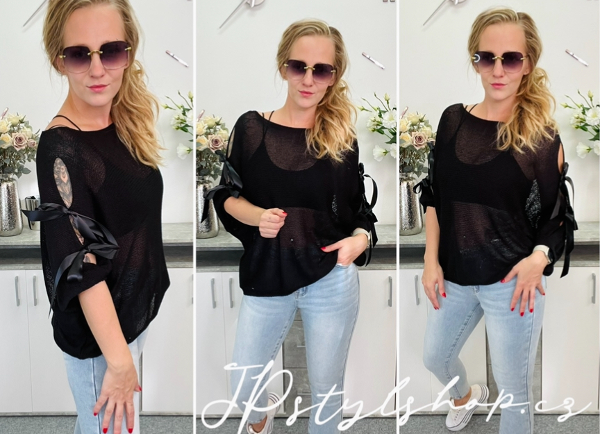 Rukávy o délce 7/8 jsou ozdobeny originálními průřezy a roztomilými mašličkami, které dodávají svetru jedinečný vzhled.