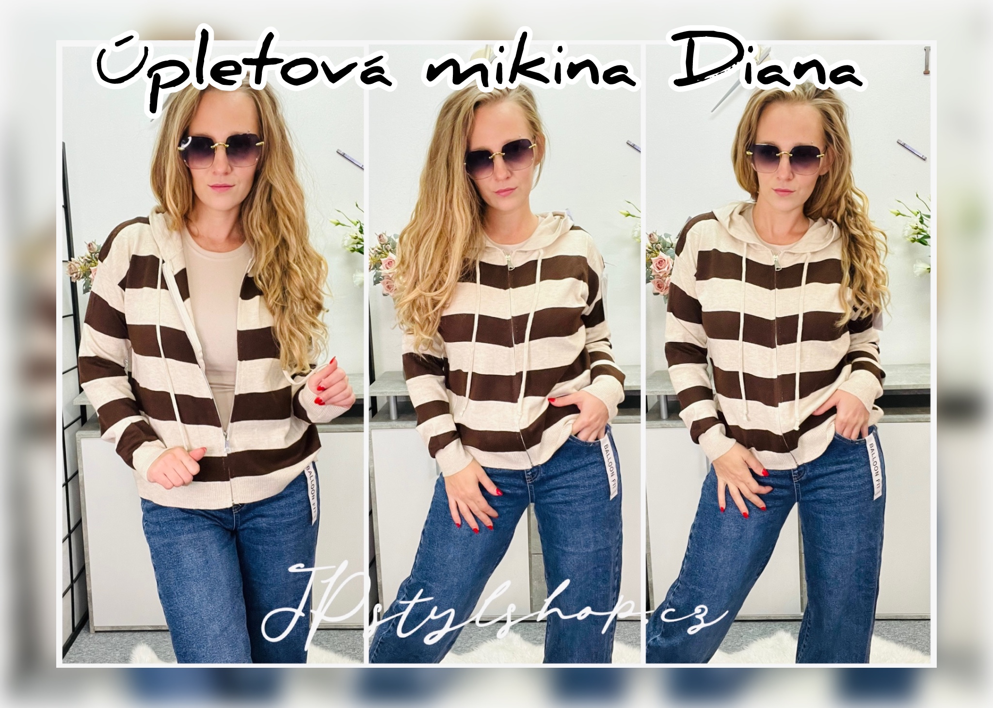 Pruhovaná úpletová mikina Diana kombinuje pohodlí a styl. Má praktické zapínání na zip, kapuci se šňůrkami a je vyrobena z velmi příjemné a pružné úpletoviny. Ideální volba pro každodenní nošení.