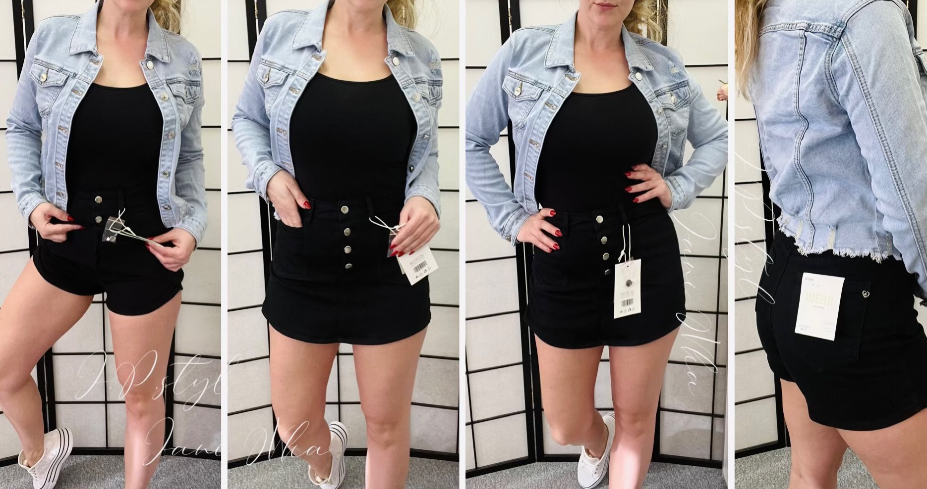 ☀Riflové kraťasy s předním dílem ve tvaru sukně a zapínání na knoflíky☀