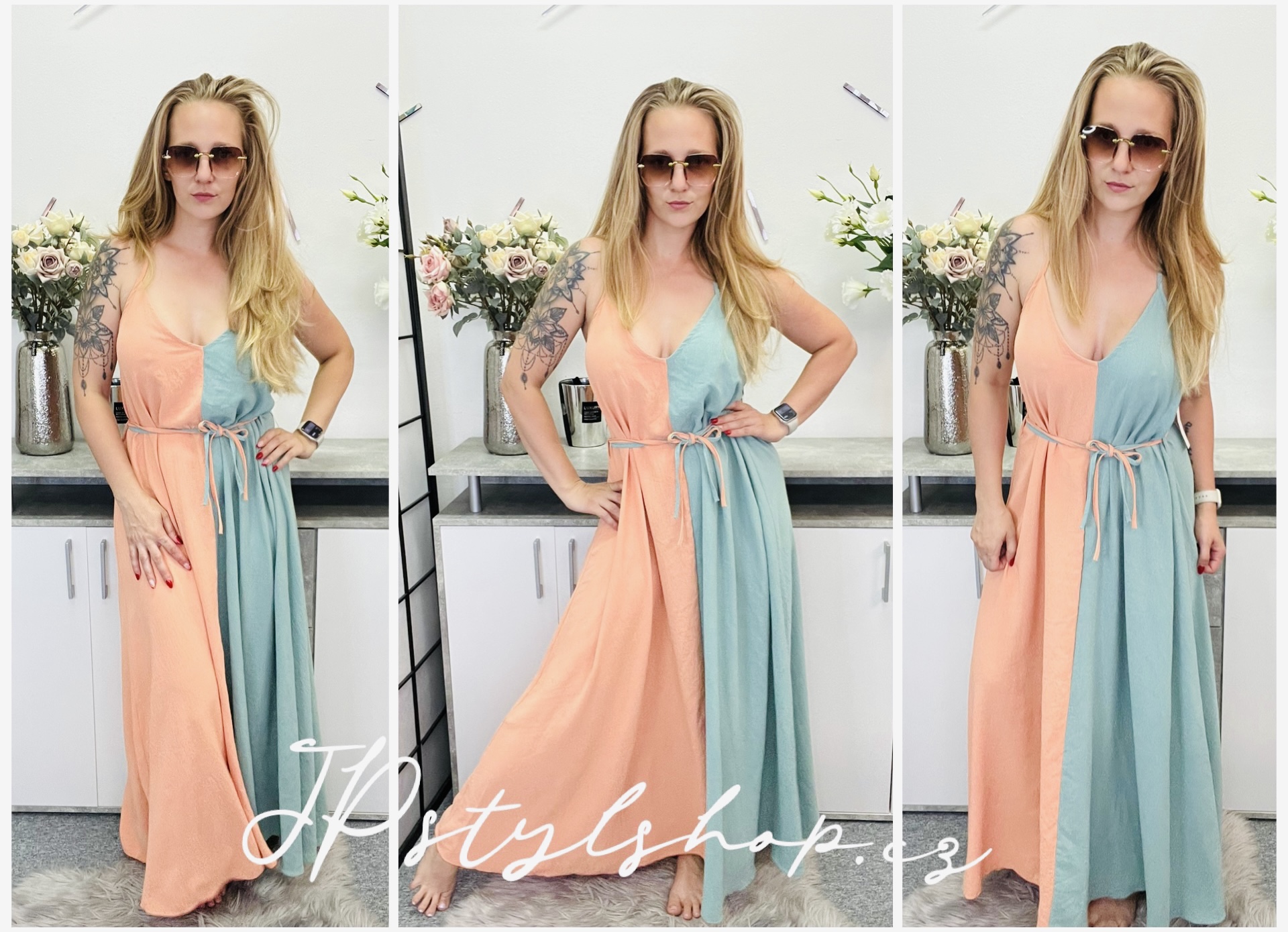 🌸 Vyrobeny z lehkého, prodyšného materiálu, který se krásně splývá a pohybuje s Vámi při každém kroku. 🌸 Šaty jsou ideální jak na denní nošení, tak i na večerní příležitosti, dovolenou nebo zahradní párty. 🌸 Kombinace dvou barev přináší svěží a moderní vzhled, který snadno sladíte s různými doplňky a obuví. 🌸
