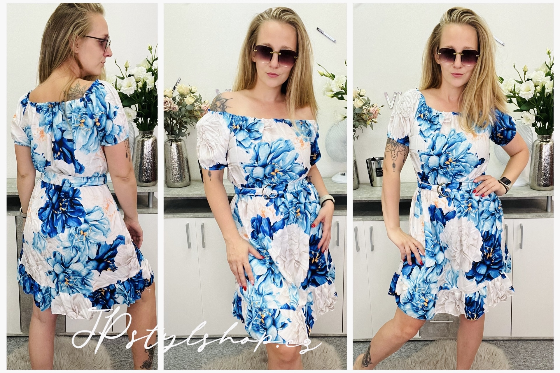 🌸Šaty s jemným modrým květinovým motivem, nabízí univerzální styl díky vršku s gumou, který umožňuje nosit je jak na ramenou, tak na spadené ramena.🌸 Rukávy jsou zakončeny gumou pro pohodlné a zároveň stylové nošení. 🌸 V pase guma a pásek v barvě šatů, který krásně zvýrazní Vaši postavu a zajistí pohodlné nošení. 🌸