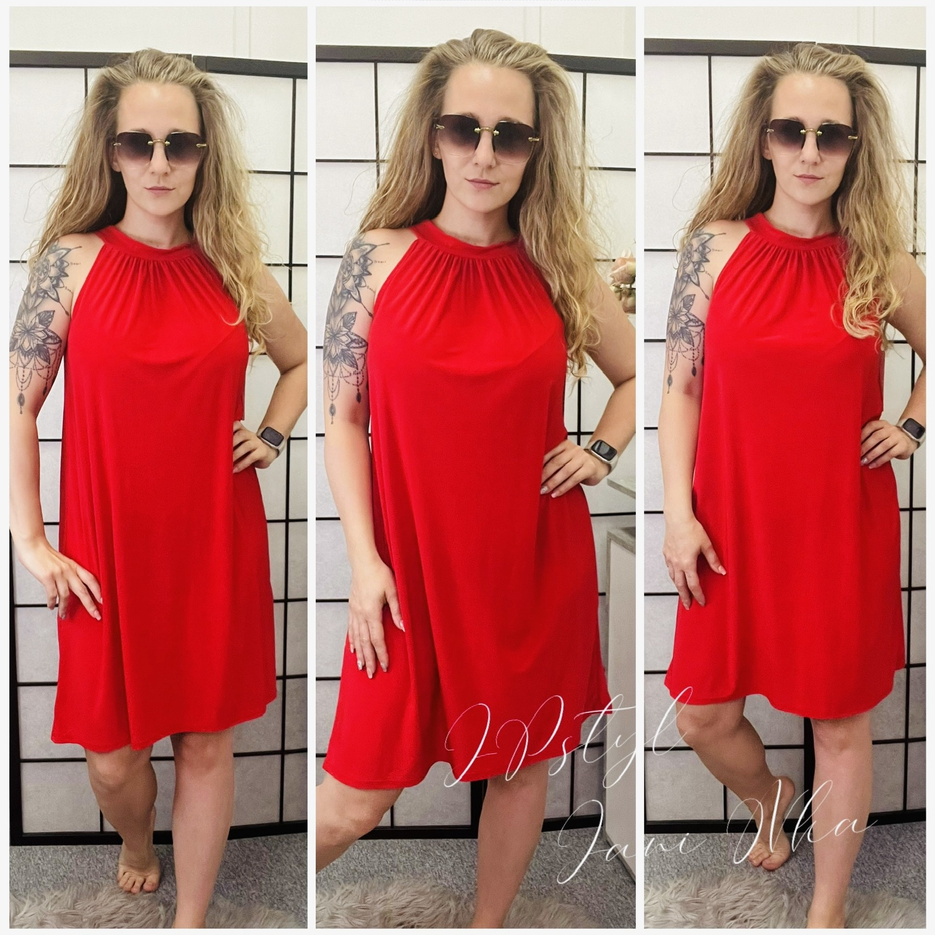 Šaty Emily šaty mají vázání za krkem, díky tomu jsou šaty velmi přizpůsobivé postavě vršek je lehce řasený volný střih  jsou velmi příjemné, pružné a chladivé 95% poliester, 5% elastan velikost oversize sedne do XL menší XXL délka 99cm, šířka v podpaží 2*... celý popis