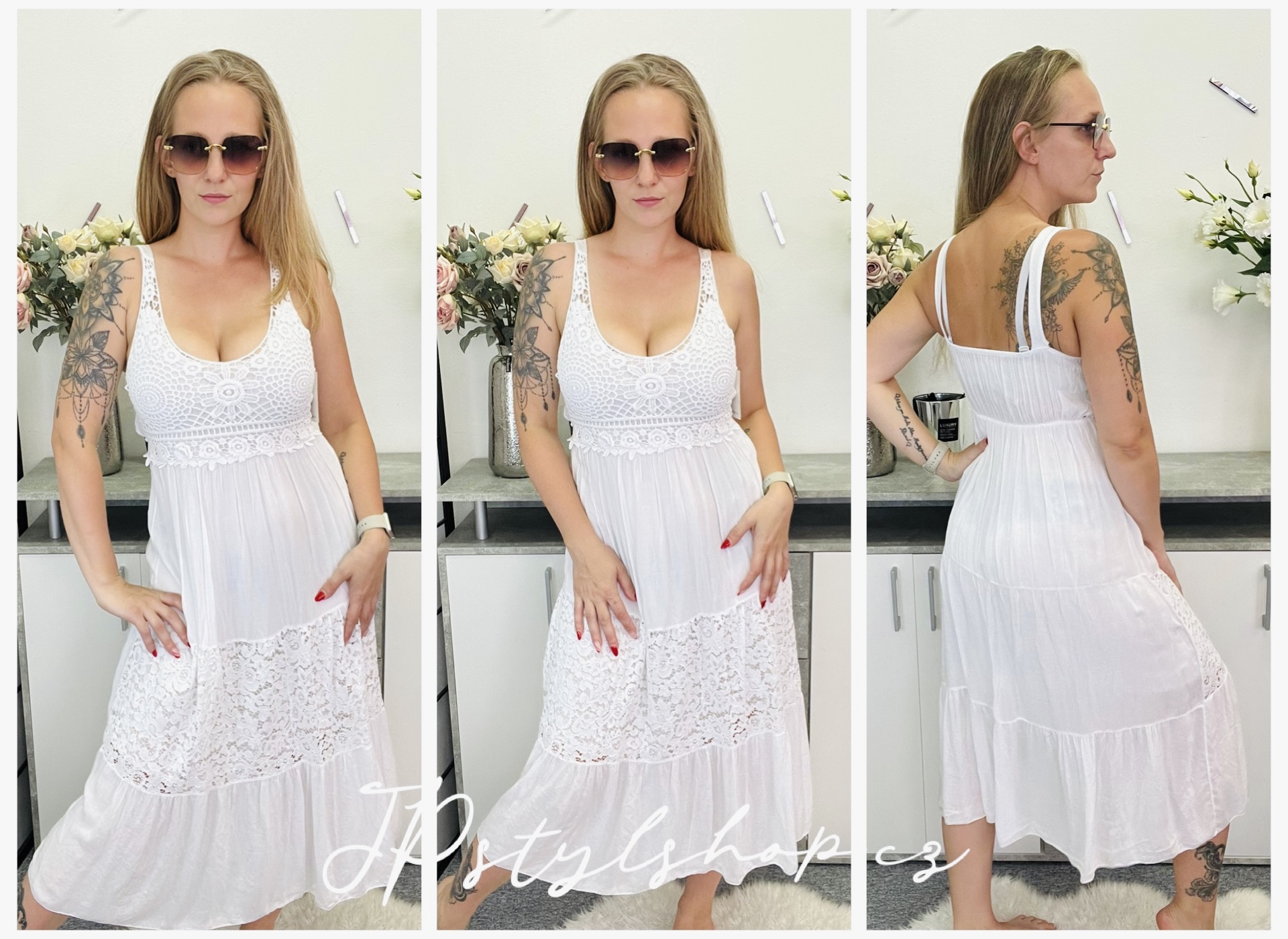 🌸 Delší šaty s jemným krajkovým vrškem z přední strany a krajkovými ramínky, které dodávají elegantní a ženský vzhled. 🌸 Pod prsy začíná volná, splývavá sukně s krajkovým dekorem, který podtrhuje lehkost a romantiku modelu 🌸 Vršek je zpevněný gumou v horní části i pod prsy, což zajišťuje pohodlné a pevné držení šatů na místě. Kratší spodnička. 🌸