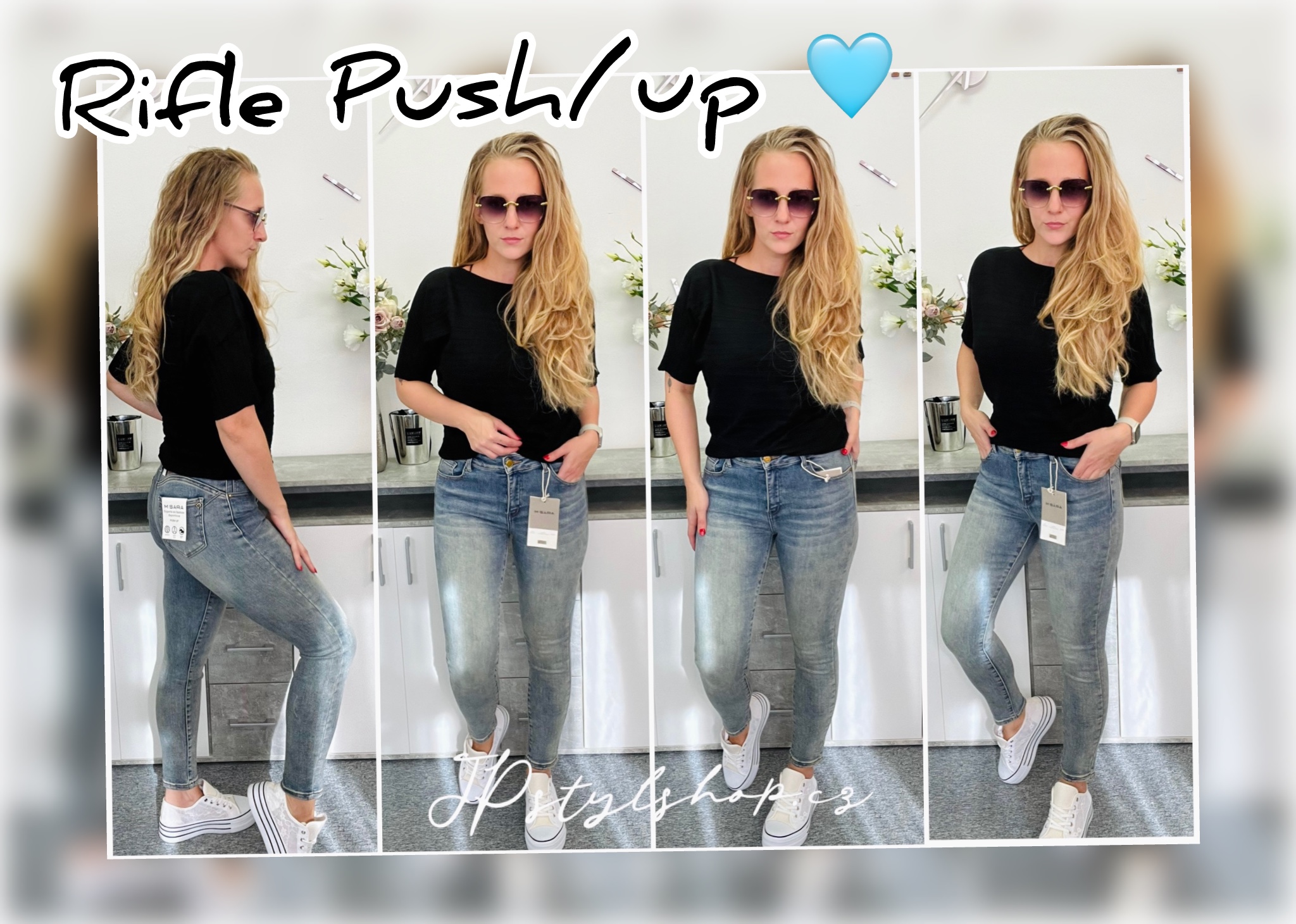 Tyto "seprané" modré rifle kombinují luxusně příjemný a pružný materiál, který zajišťuje maximální pohodlí během celého dne. Zapínání na knoflík a zip je praktické a zároveň stylové. Speciální srdíčkový push/up detail na zadečku efektivně zvýrazní tvar a dodají Vaší postavě sexy kontury.