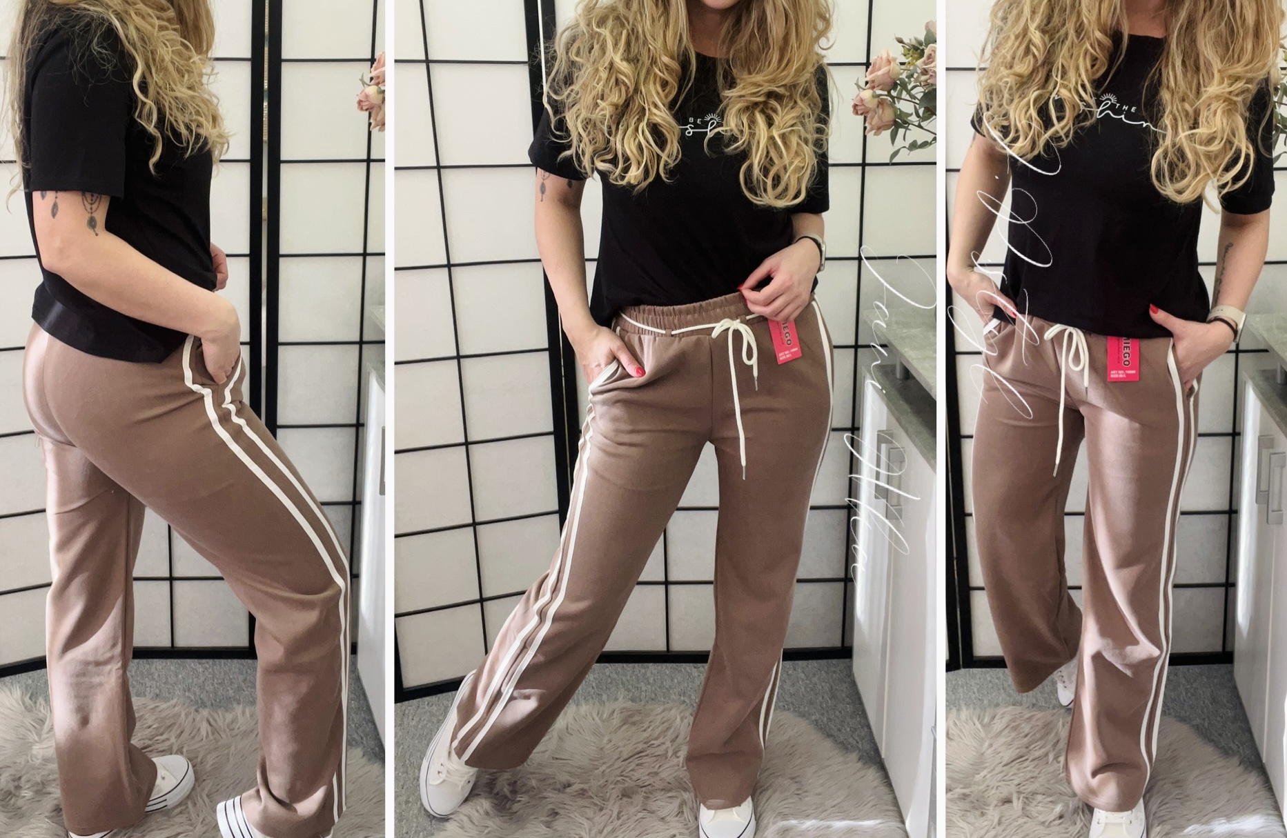 Tepláčky s pruhy v pase guma + šňůrka na stažení (lze oddělat) boční kapsy široké nohavice 85% bavlna, 10% polyester, 5% elastan Rozměr: S/M - délka 104cm, pas 2* 28/44cm M/L - délka 106cm, pas 2* 30/46cm XL/XXL - délka 108cm, pas 2* 32/48cm celý popis