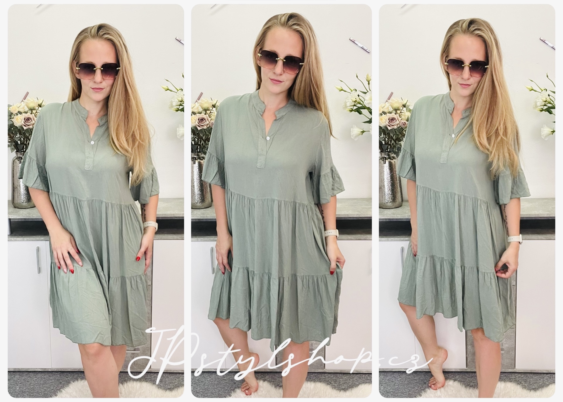 🌸Tunikové šaty s výstřihem do V, který je doplněný dvěma knoflíčky. 🌸 Delší rukávky zakončené volánkem dodávají šatům jemný a ženský vzhled. 🌸 Sukně od podprsí je řasená, což vytváří působivý a nadýchaný efekt. 🌸 Volný střih do áčka zaručuje pohodlí a volnost pohybu.🌸